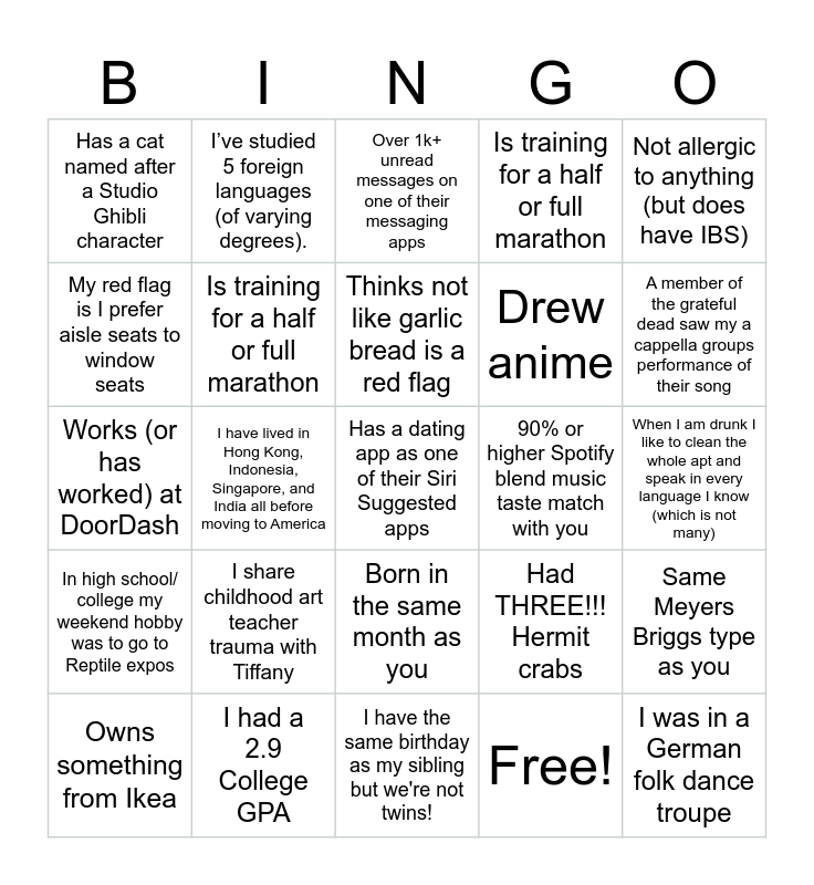 This bingo card has 30 words: I had a 2.9 College GPA, I didn't own a pair of jeans until tenth grade, I have lived in Hong Kong, Indonesia, Singapore, and India all before moving to America, When I was 6, I got into an argument with my grandpa arguing that I was Jewish, Has a cat named after a Studio Ghibli character, Over 1k+ unread messages on one of their messaging apps, Is training for a half or full marathon, Born in the same month as you, 90% or higher Spotify blend music taste match with you, I have the same birthday as my sibling but we're not twins!, When I am drunk I like to clean the whole apt and speak in every language I know (which is not many), Has a dating app as one of their Siri Suggested apps, Free!, I was in a German folk dance troupe, A member of the grateful dead saw my a cappella groups performance of their song, Owns something from Ikea, Had THREE!!! Hermit crabs, In high school/ college my weekend hobby was to go to Reptile expos, I share childhood art teacher trauma with Tiffany, Not allergic to anything (but does have IBS), Works (or has worked) at DoorDash, Has a Costco membership, I’ve studied 5 foreign languages (of varying degrees)., Drew anime, My red flag is I prefer aisle seats to window seats, Is training for a half or full marathon, Same Meyers Briggs type as you, Owns something from Ikea, Thinks not like garlic bread is a red flag and Is wearing something thrifted.