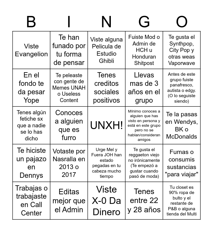 This bingo card has a free space and 24 words: Votaste por Nasralla en 2013 o 2017, Editas mejor que el Admin, Tenes creditos sociales positivos, Trabajas o trabajaste en Call Center, Te gusta el Synthpop, City Pop y otras weas Vaporwave, Viste Evangelion, En el fondo te da pesar Yope, Te han funado por tu forma de pensar, Mínimo conoces a alguien que has visto en persona y está en este grupo pero no se hablan/consideran amigos, Urge Mel y Fuera JOH han estado pegadas en tu cabeza mucho tiempo, Llevas mas de 3 años en el grupo, Tenes algún fetiche sx que a nadie se lo has dicho, Te gusta el reggaeton viejo no irónicamente (Te empezó a gustar cuando pasó de moda), Fumas o consumis sustancias "para viajar", Te peleaste con gente de Memes UNAH o Useless Content, Tenes entre 22 y 28 años, Te la pasas en Wendys, BK o McDonalds, Viste alguna Pelicula de Estudio Ghibli, Antes de este grupo fuiste panafresco, autista o edgy. (O lo seguiste siendo), Conoces a alguien que es furro, Tu closet es 90% ropa de bulto y el restante de P&B o alguna tienda del Multi, Te hiciste un pajazo en Dennys, Fuiste Mod o Admin de HCH u Honduran Shitpost and Viste X-0 Da Dinero.