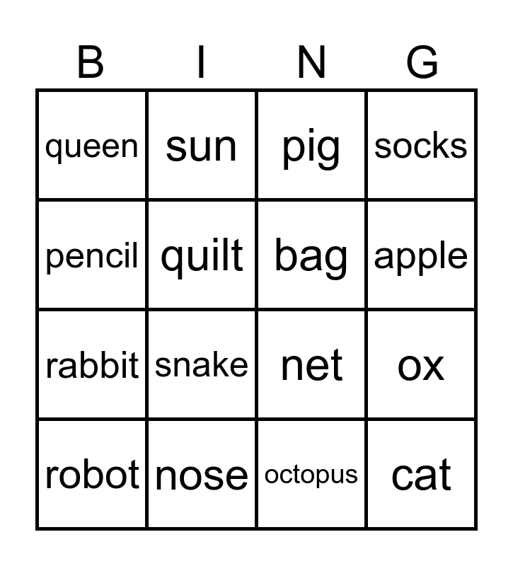 This bingo card has 16 words: nose, ox, pig, queen, rabbit, sun, net, octopus, pencil, quilt, robot, socks, snake, apple, bag and cat.