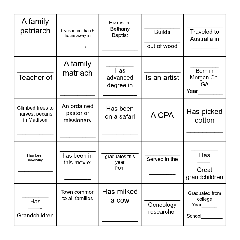 This bingo card has 30 words: Town common to all families ____________, _____________ lives on a farm in ——————, An ordained pastor or missionary ___________, _________ a member of a choir, A family patriarch ________, Pianist at Bethany Baptist ____________, A family matriach ________, ______________ graduates this year from ____________, A CPA ________, Has milked a cow _________, Has picked cotton _________, Has been on a safari __________, ___________ Geneology researcher, Graduated from college Year______ School________, _________ Born in Morgan Co. GA Year________, Has a book published _________, ____________ Served in the _________, Has been skydiving ________________, ___________ has been in this movie: ________, ___________ Traveled to Australia in ________, Climbed trees to harvest pecans in Madison _____________, _____________ Has visited to 4 continents, ______________ Lives more than 6 hours away in ___________,____, _________ Is an artist, _________ Teacher of ________, ___________ Builds ___________ out of wood, ________ Has ——- Great grandchildren, ________ Has ——- Grandchildren, ________ Has advanced degree in __________ and _______ Owns a dog named _______.