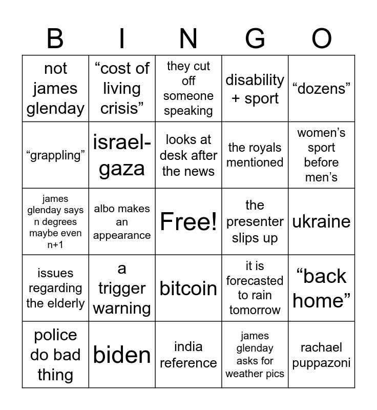 This bingo card has a free space and 41 words: olympics, james glenday says n degrees maybe even n+1, david pocock/ bald white guy that looks similar, israel-gaza, biden, bitcoin, looks at desk after the news, canberra sports team loses, “dozens”, issues regarding the elderly, albo makes an appearance, disability + sport, rachael puppazoni, ukraine, the presenter slips up, a trigger warning, expressive statement during the weather, not james glenday, local institution, they cut off someone speaking, “back home”, trump, india reference, the royals mentioned, they say “gen z”, bruce lehrmann, james glenday asks for weather pics, hot weather, women’s sport before men’s, ANU mentioned, We see a place that we’ve been to, “cost of living crisis”, police do bad thing, dead white woman, it is forecasted to rain tomorrow, “grappling”, china, shane rattenbury, gay, “reeling” and “fighting for their life”.