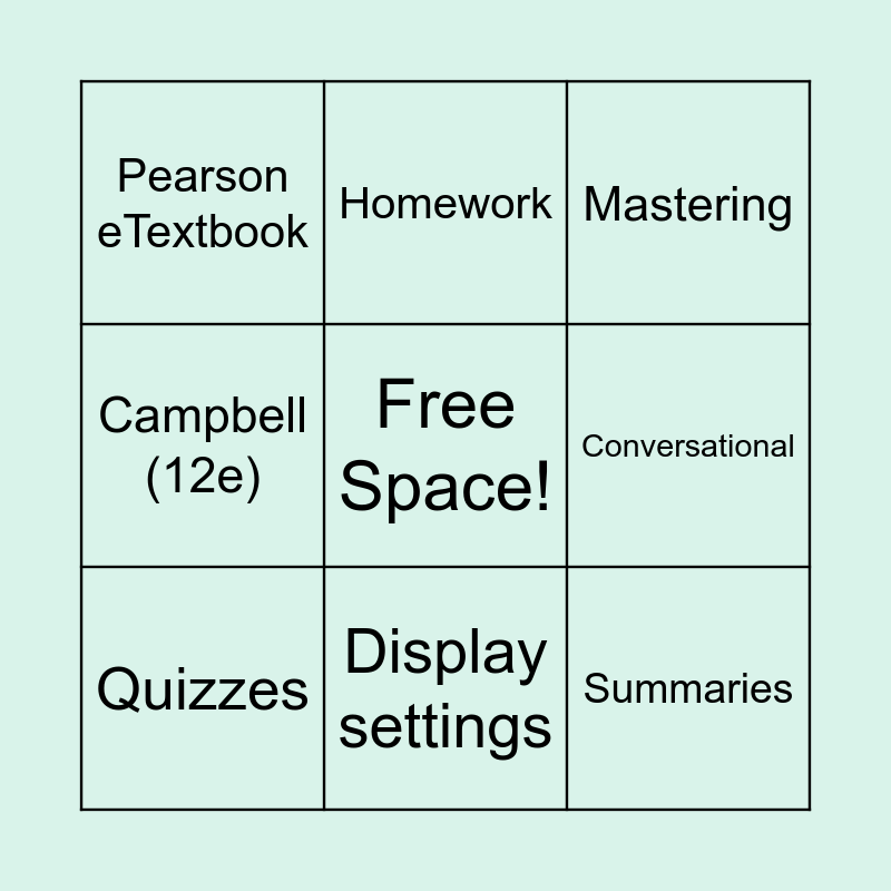 This bingo card has a free space and 16 words: Intuitive search, Video and interactive features, Mastering, Pearson eTextbook, with access across any device, Homework, Read aloud, Pearson content, Summaries, Conversational, MyLab, Campbell (12e), Notes, flashcards and hashtags, Display settings, Quizzes and Mobile app.