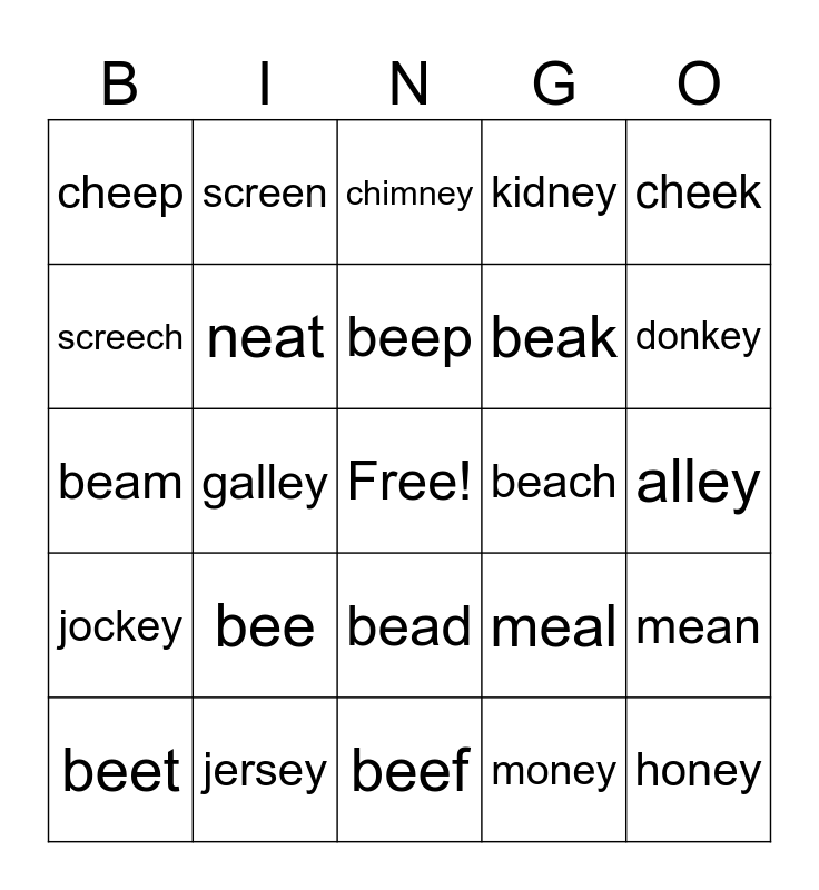 This bingo card has a free space and 25 words: bee, beef, beep, beet, cheek, cheep, screech, screen, beach, bead, beak, beam, meal, mean, neat, please, alley, chimney, donkey, galley, honey, jersey, jockey, kidney and money.