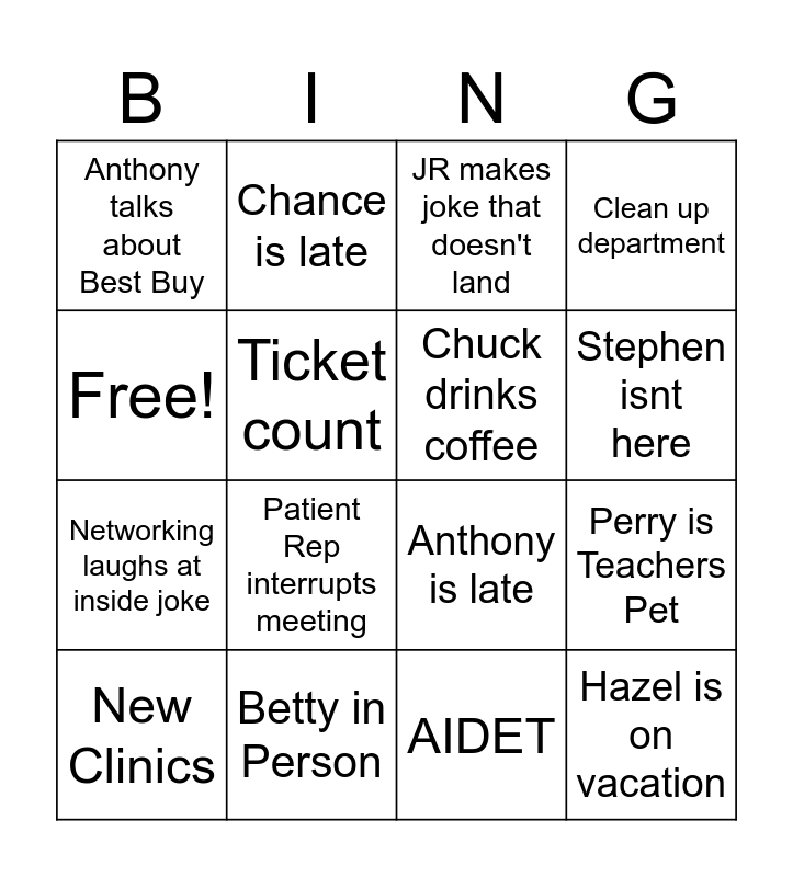 This bingo card has 16 words: Betty in Person, Perry is Teachers Pet, JR makes joke that doesn't land, Anthony talks about Best Buy, Networking laughs at inside joke, Chance is late, Anthony is late, AIDET, Free!, Ticket count, New Clinics, Clean up department, Patient Rep interrupts meeting, Stephen isnt here, Chuck drinks coffee and Hazel is on vacation.