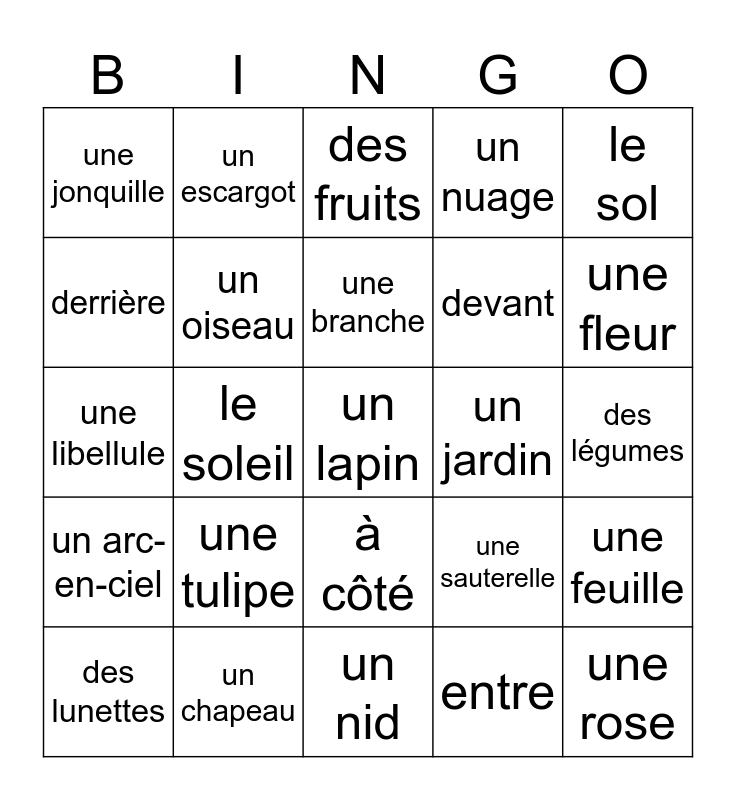 This bingo card has 36 words: une chenille, un papillon, un écureuil, un oiseau, une sauterelle, un arc-en-ciel, une branche, un arbre, le sol, la terre, le soleil, un nuage, Free!, un jardin, une fleur, une jonquille, une rose, une tulipe, un lapin, des fruits, des légumes, une feuille, un chapeau, des lunettes, un nid, un escargot, une libellule, du bambou, devant, derrière, sur, sous, entre, à côté, dans and avec.