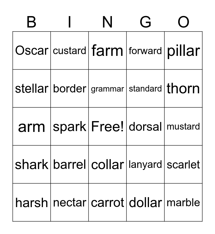 This bingo card has a free space and 26 words: collar, dollar, grammar, nectar, pillar, Oscar, stellar, custard, mustard, lanyard, standard, arm, scarlet, harsh, spark, starve, forward, shark, farm, marble, thorn, carrot, dorsal, barrel, border and nurse.