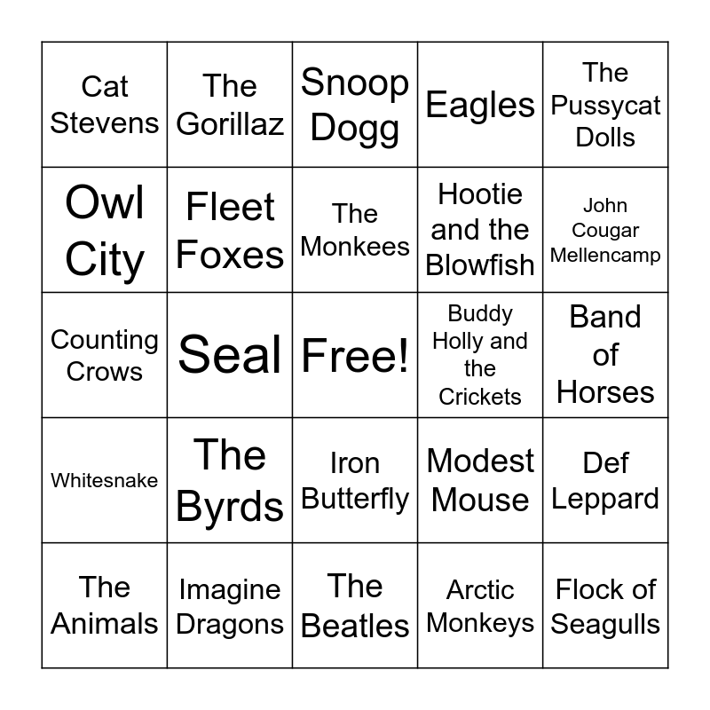 This bingo card has a free space and 25 words: The Byrds, The Beatles, The Monkees, The Animals, The Pussycat Dolls, Cat Stevens, Owl City, The Gorillaz, Buddy Holly and the Crickets, Iron Butterfly, Hootie and the Blowfish, Counting Crows, Modest Mouse, Def Leppard, Fleet Foxes, Black Pumas, Band of Horses, Snoop Dogg, John Cougar Mellencamp, Seal, Flock of Seagulls, Imagine Dragons, Whitesnake, Eagles and Arctic Monkeys.