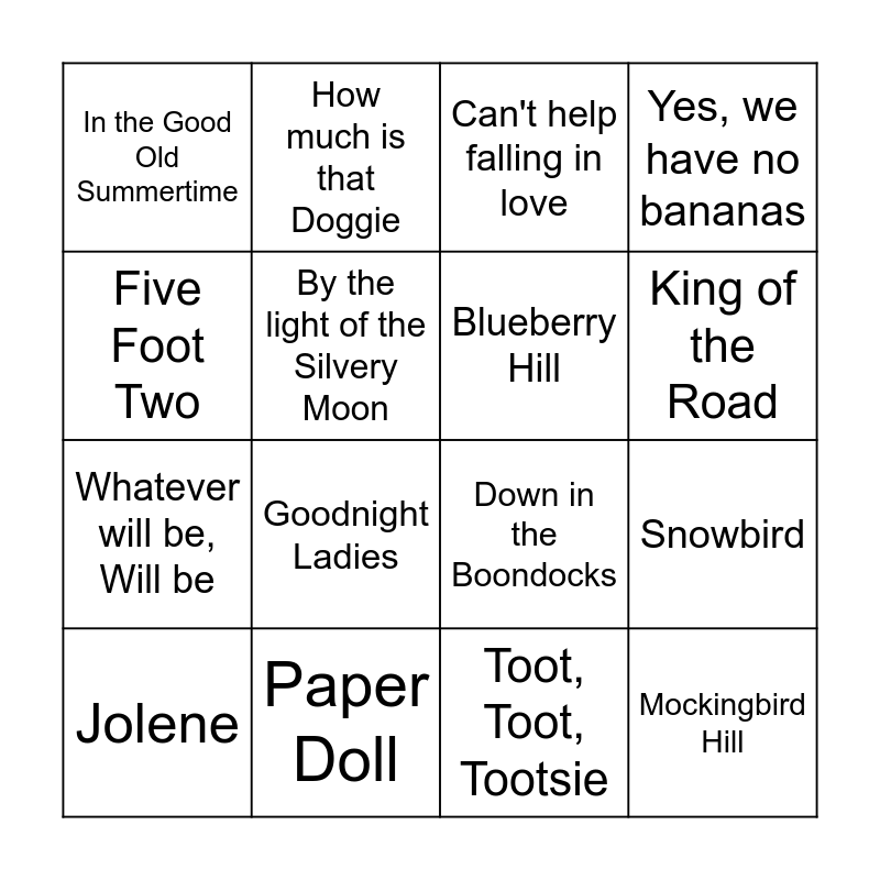 This bingo card has 38 words: Free!, Bicycle Build for Two, Ain't she Sweet, Blueberry Hill, Ring of Fire, You are my Sunshine, King of the Road, Yakety Yak, Five Foot Two, Whatever will be, Will be, Snowbird, Yes, we have no bananas, Jolene, Toot, Toot, Tootsie, By the light of the Silvery Moon, Mockingbird Hill, Farwell to Nova Scotia, Can't help falling in love, Ain't we got fun, Paper Doll, In the Good Old Summertime, I've been working on the Railroad, Goodnight Ladies, Red River Valley, When the Saints go Marching in, Alexanders Rag Time Band, Copacabana, Oh! How I hate to get up in the morning, Rockin' Robin, Amazing Grace, Blessed Assurance, Lazy River, The Gambler, How much is that Doggie, Diana, Working Man, Down in the Boondocks and Rivers of Babylon.