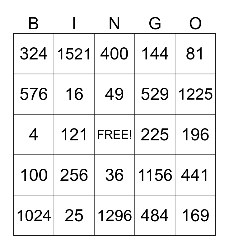 This bingo card has a free space and 40 words: 1, 4, 9, 16, 25, 36, 49, 64, 81, 100, 121, 144, 169, 196, 225, 256, 289, 324, 361, 400, 441, 484, 529, 576, 625, 676, 729, 784, 841, 900, 961, 1024, 1089, 1156, 1225, 1296, 1369, 1444, 1521 and 1600.