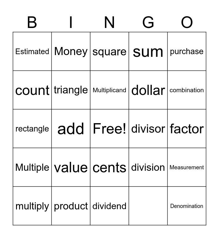 This bingo card has a free space and 23 words: Multiple, multiply, Multiplicand, Measurement, purchase, Estimated, count, Money, Denomination, value, combination, dollar, cents, division, divisor, dividend, square, rectangle, triangle, add, sum, factor and product.