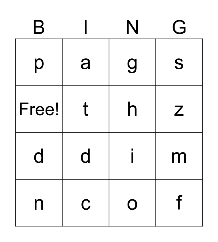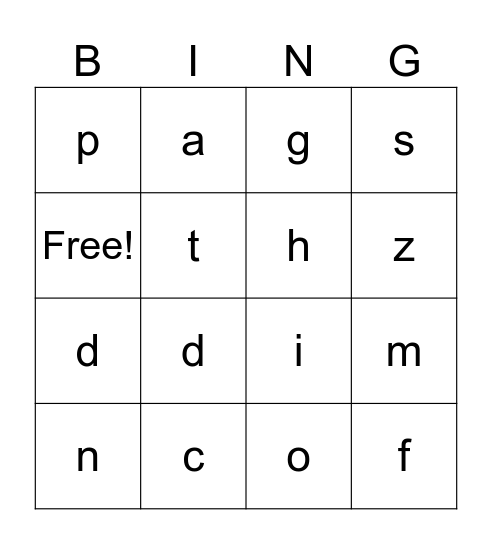 This bingo card has 16 words: c, m, g, p, d, a, i, o, Free!, t, n, s, d, z, h and f.