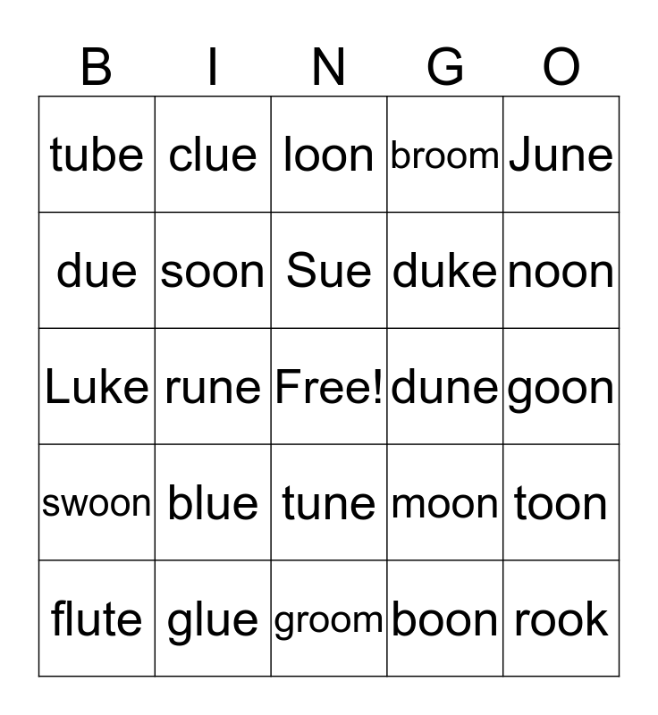 This bingo card has a free space and 24 words: blue, glue, Sue, flute, June, tube, due, clue, dune, tune, duke, Luke, moon, toon, soon, boon, goon, loon, noon, rune, rook, swoon, broom and groom.