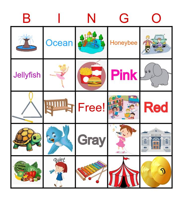 This bingo card has 22 images, a free space and 7 words: Pink, Red, Jellyfish, Ocean, Gray, Honeybee and Frog.