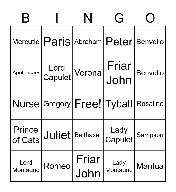 This bingo card has a free space and 24 words: Juliet, Romeo, Verona, Lord Montague, Benvolio, Mercutio, Apothecary, Paris, Tybalt, Balthasar, Friar John, Nurse, Lady Capulet, Sampson, Lord Capulet, Lady Montague, Rosaline, Abraham, Benvolio, Gregory, Mantua, Prince of Cats, Peter and Friar John.