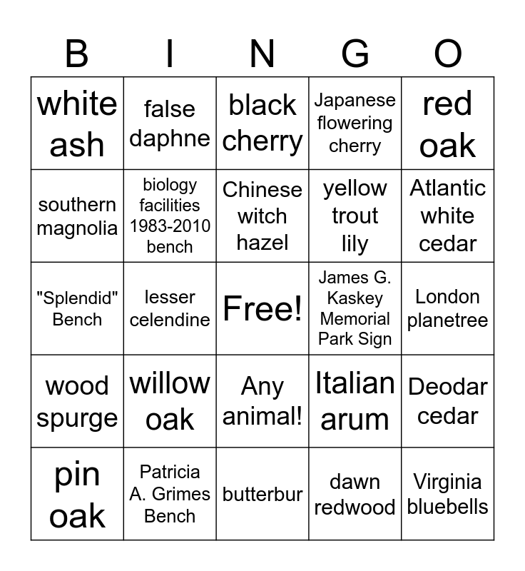 This bingo card has a free space and 33 words: Lydia Morris holly, American beech, lesser celendine, hackberry, wood spurge, biology facilities 1983-2010 bench, red oak, pin oak, false daphne, Alabama snow wreath, Chinese witch hazel, black cherry, Biopond, Japanese maple, James G. Kaskey Memorial Park Sign, Atlantic white cedar, Patricia A. Grimes Bench, "Splendid" Bench, willow oak, Italian arum, Any animal!, water mold, white ash, London planetree, butterbur, Virginia bluebells, Japanese flowering cherry, yellow trout lily, southern magnolia, Deodar cedar, American elm, dawn redwood and isu-tree.