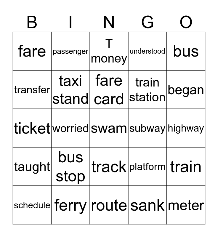 This bingo card has 25 words: bus stop, route, fare card, schedule, bus, fare, transfer, passenger, subway, track, train station, ticket, platform, train, taxi stand, meter, highway, T money, began, worried, swam, ferry, taught, understood and sank.