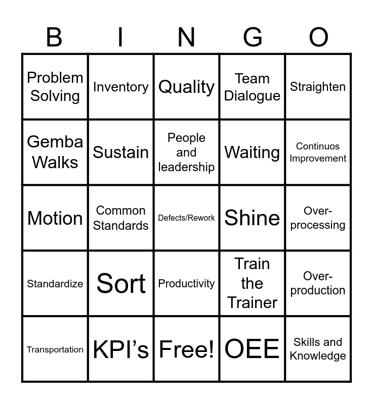 This bingo card has 25 words: Standardize, KPI’s, Defects/Rework, OEE, Straighten, Problem Solving, Inventory, Quality, Shine, Over-production, Gemba Walks, Sustain, Free!, Train the Trainer, Continuos Improvement, Transportation, Common Standards, People and leadership, Waiting, Over-processing, Motion, Sort, Productivity, Team Dialogue and Skills and Knowledge.