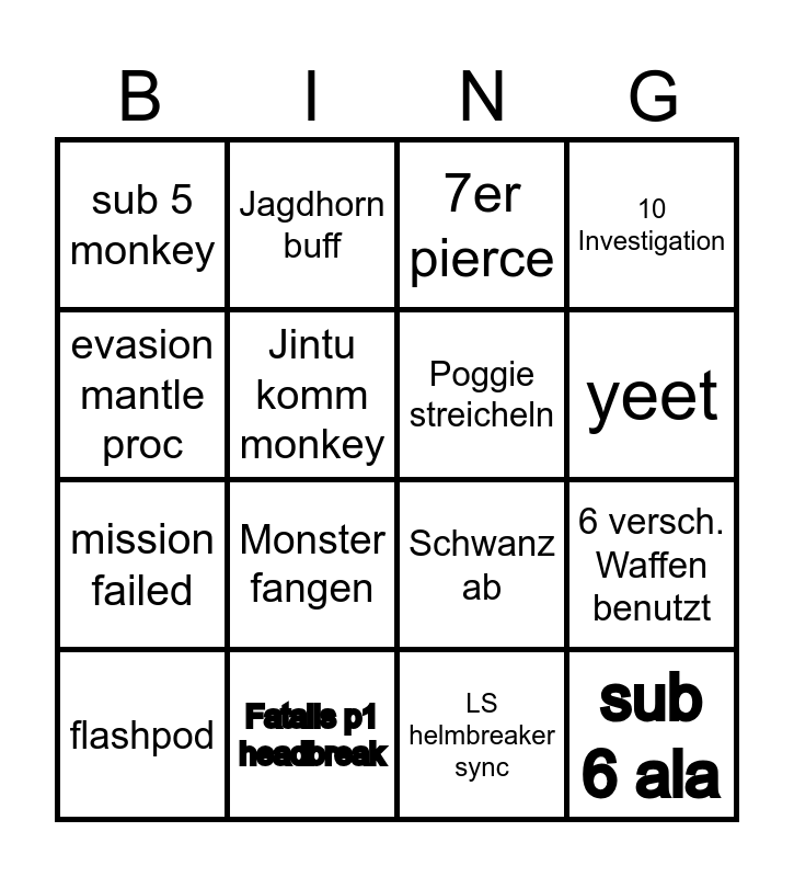 This bingo card has 16 words: Fatalis p1 headbreak, 6 versch. Waffen benutzt, 7er pierce, sub 5 monkey, mission failed, Jagdhorn buff, Schwanz ab, LS helmbreaker sync, evasion mantle proc, Jintu komm monkey, flashpod, 10 Investigation, Monster fangen, yeet, Poggie streicheln and sub 6 ala.