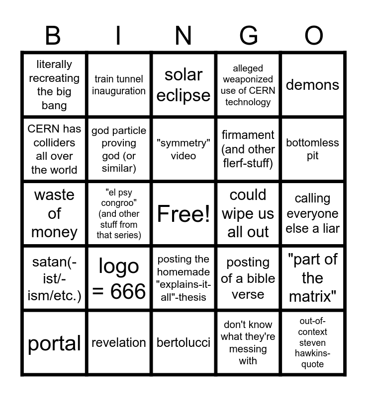 This bingo card has a free space and 34 words: playing god, don't know what they're messing with, shiva (-statue), apollyon, satan(-ist/-ism/etc.), god particle proving god (or similar), demons, portal, train tunnel inauguration, ritual, "symmetry" video, solar eclipse, black hole, scientists "gambling", could wipe us all out, bottomless pit, revelation, waste of money, logo = 666, posting of a bible verse, posting the homemade "explains-it-all"-thesis, causing earth quakes, literally recreating the big bang, calling everyone else a liar, bertolucci, out-of-context steven hawkins-quote, alleged weaponized use of CERN technology, LHC destroys magnetic field of the Earth, firmament (and other flerf-stuff), CERN has colliders all over the world, cernunnos, "el psy congroo" (and other stuff from that series), "part of the matrix" and built on top of a temple.