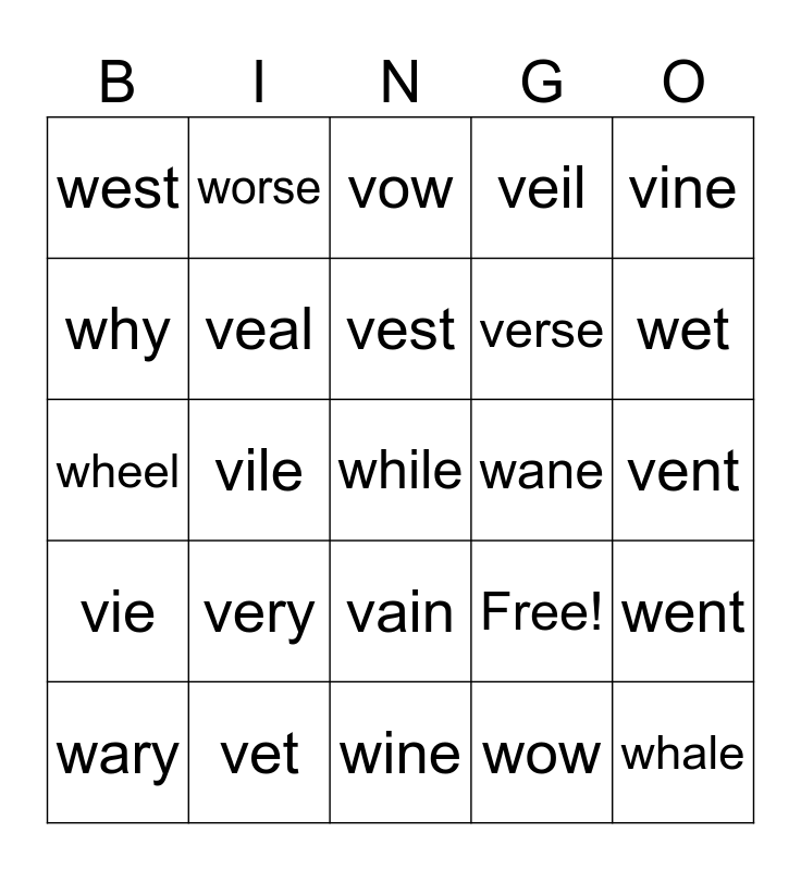 This bingo card has 25 words: very, wine, vest, wary, vine, west, why, worse, wane, vain, verse, wheel, Free!, went, veal, whale, vent, vow, wet, vile, while, vet, vie, veil and wow.
