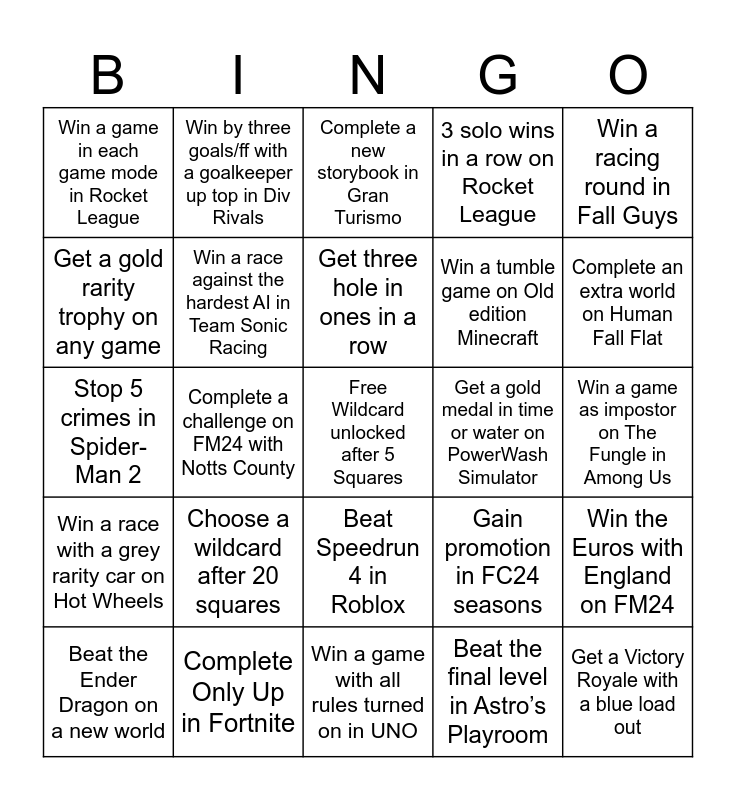 This bingo card has a free space and 24 words: Beat the Ender Dragon on a new world, Choose a wildcard after 20 squares, Get three hole in ones in a row, Beat the final level in Astro’s Playroom, Win a racing round in Fall Guys, Win a game in each game mode in Rocket League, Win by three goals/ff with a goalkeeper up top in Div Rivals, Complete a new storybook in Gran Turismo, Get a gold medal in time or water on PowerWash Simulator, Win a game as impostor on The Fungle in Among Us, Stop 5 crimes in Spider-Man 2, Win a race against the hardest AI in Team Sonic Racing, Gain promotion in FC24 seasons, Win the Euros with England on FM24, Get a gold rarity trophy on any game, Complete Only Up in Fortnite, Win a game with all rules turned on in UNO, 3 solo wins in a row on Rocket League, Complete an extra world on Human Fall Flat, Win a race with a grey rarity car on Hot Wheels, Complete a challenge on FM24 with Notts County, Beat Speedrun 4 in Roblox, Win a tumble game on Old edition Minecraft and Get a Victory Royale with a blue load out.