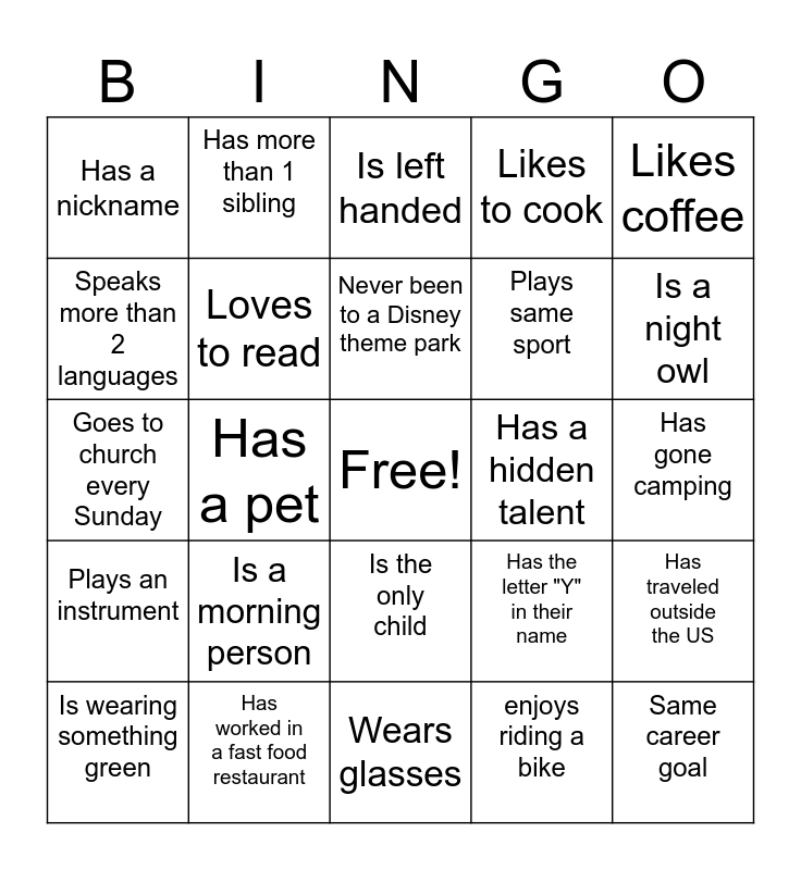 This bingo card has a free space and 24 words: Is a morning person, Has worked in a fast food restaurant, Never been to a Disney theme park, Is wearing something green, Likes coffee, Has a nickname, Speaks more than 2 languages, Has more than 1 sibling, Has a hidden talent, Is the only child, Plays same sport, Goes to church every Sunday, Has the letter "Y" in their name, Has traveled outside the US, Loves to read, enjoys riding a bike, Has gone camping, Is left handed, Is a night owl, Has a pet, Same career goal, Plays an instrument, Likes to cook and Wears glasses.