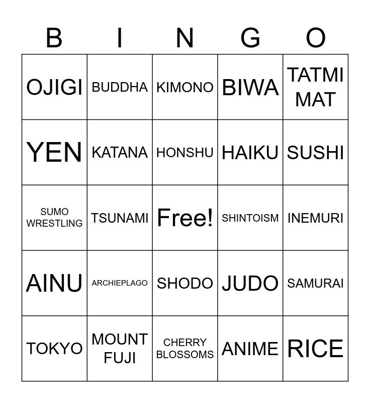 This bingo card has a free space and 24 words: ARCHIEPLAGO, MOUNT FUJI, HONSHU, TOKYO, TATMI MAT, OJIGI, YEN, BUDDHA, SHINTOISM, SHODO, HAIKU, SUMO WRESTLING, JUDO, SAMURAI, KATANA, ANIME, INEMURI, KIMONO, SUSHI, TSUNAMI, RICE, AINU, BIWA and CHERRY BLOSSOMS.
