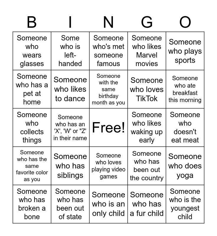 This bingo card has a free space and 24 words: Someone who has siblings, Someone who has been out of state, Someone with the same birthday month as you, Someone who has broken a bone, Someone who plays sports, Someone who wears glasses, Someone who has a pet at home, Some who is left-handed, Someone who likes waking up early, Someone who loves playing video games, Someone who loves TikTok, Someone who collects things, Someone who has been out the country, Someone who does yoga, Someone who likes to dance, Someone who has a fur child, Someone who doesn't eat meat, Someone who's met someone famous, Someone who ate breakfast this morning, Someone who has an 'X', 'W' or "Z' in their name, Someone who is the youngest child, Someone who has the same favorite color as you, Someone who likes Marvel movies and Someone who is an only child.