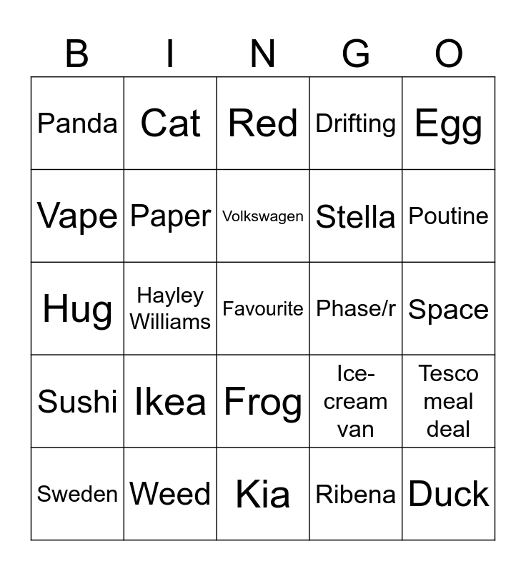 This bingo card has a free space and 24 words: Ikea, Weed, Volkswagen, Sweden, Egg, Panda, Vape, Cat, Phase/r, Frog, Stella, Hug, Ice-cream van, Tesco meal deal, Paper, Ribena, Space, Red, Poutine, Hayley Williams, Duck, Sushi, Drifting and Kia.