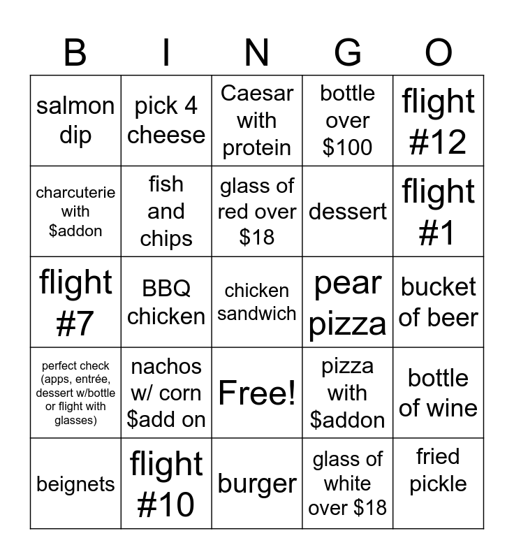 This bingo card has 26 words: Free!, beignets, fish and chips, bottle of wine, bottle over $100, flight #12, charcuterie with $addon, pick 4 cheese, glass of red over $18, glass of white over $18, flight #1, flight #7, flight #10, burger, pear pizza, fried pickle, salmon dip, nachos w/ corn $add on, Caesar with protein, pizza with $addon, bucket of beer, perfect check (apps, entrée, dessert w/bottle or flight with glasses), BBQ chicken, chicken sandwich, dessert and bottle of wine.