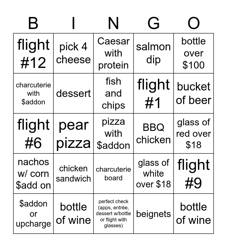 This bingo card has 26 words: charcuterie board, beignets, fish and chips, bottle of wine, bottle over $100, flight #12, charcuterie with $addon, pick 4 cheese, glass of red over $18, glass of white over $18, flight #1, flight #6, flight #9, $addon or upcharge, pear pizza, fried pickle, salmon dip, nachos w/ corn $add on, Caesar with protein, pizza with $addon, bucket of beer, perfect check (apps, entrée, dessert w/bottle or flight with glasses), BBQ chicken, chicken sandwich, dessert and bottle of wine.