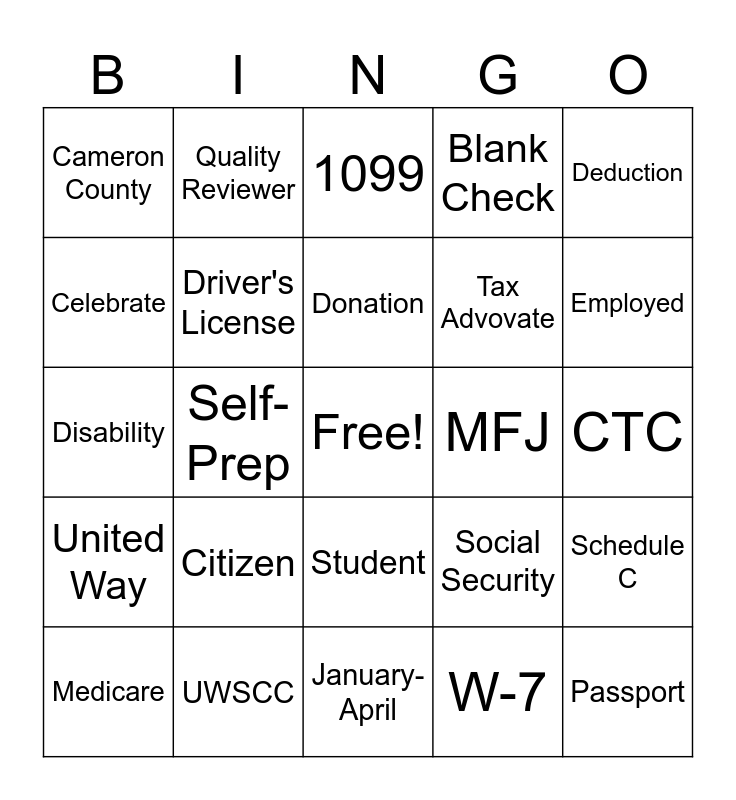 This bingo card has a free space and 80 words: $$$, 1040, 1099, 15-Apr, 1095-A, 1099 Misc, Advanced, Amount Owed, Anually, April, Audit, Basic, Blank Check, Cameron County, Cash Gift, Celebrate, Certification, Citizen, Credit, CTC, Deadline, Deduction, Disability, Donation, Driver's License, Due Diligence, Due Diligent, Earned Income, E-File, EITC, Employed, ITIN, January-April, Life Skill, Medicare, MFJ, Money Order, Offset, Parent, Passport, Paycheck, Payroll, Paystub, Penalties, Penalty, Quality Reviewer, Refund, Retired, Rollover, Schedule A, Schedule C, Self-Prep, Social Security, Spouse, SSA, Dependment, Standard Deduction, State, Status, Student, Tax Advovate, Tax Liability, Tax Preparer, Tax Rate, Tax Return, Tax Year, Taxes, TSC, Unemployed, Unemployment, United Way, UWSCC, VITA, Volunteer, W-2, W-4, W-7, Where’s My Refund, 1040-X and Medicaid.