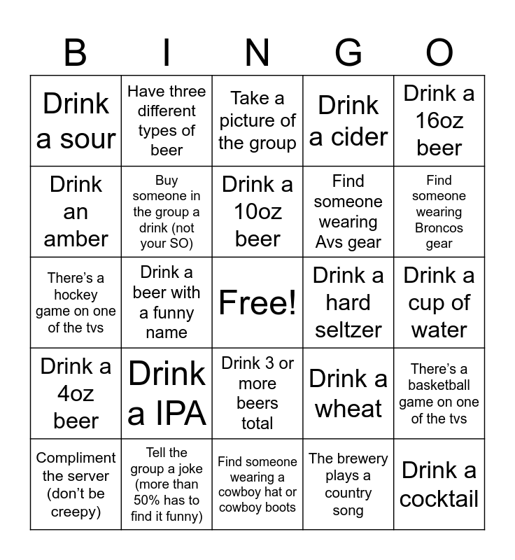 This bingo card has a free space and 39 words: Been to three places, Buy a snack to share with the group, Buy merchandise from a brewery, Buy someone in the group a drink (not your SO), Compliment the server (don’t be creepy), Drink 3 or more beers total, Drink a 10oz beer, Drink a 12oz beer, Drink a 16oz beer, Drink a 4oz beer, Drink a beer with a funny name, Drink a cider, Drink a cocktail, Drink a cup of water, Drink a hard seltzer, Drink a IPA, Drink a pilsner, Drink a sour, Drink a stout, Drink a wheat, Drink an amber, Find someone wearing a cowboy hat or cowboy boots, Find someone wearing Avs gear, Find someone wearing Broncos gear, Find someone wearing CU gear, Find someone wearing Nuggets gear, Find someone wearing Rockies gear, Get a flight, Get something to eat, Have three different types of beer, Play a game at a brewery, Point out 3 dogs to Candice, Take a picture of the group, Tell the group a joke (more than 50% has to find it funny), The brewery plays a country song, There’s a baseball game on one of the tvs, There’s a basketball game on one of the tvs, There’s a hockey game on one of the tvs and There’s something non-sports related on one of the tvs.