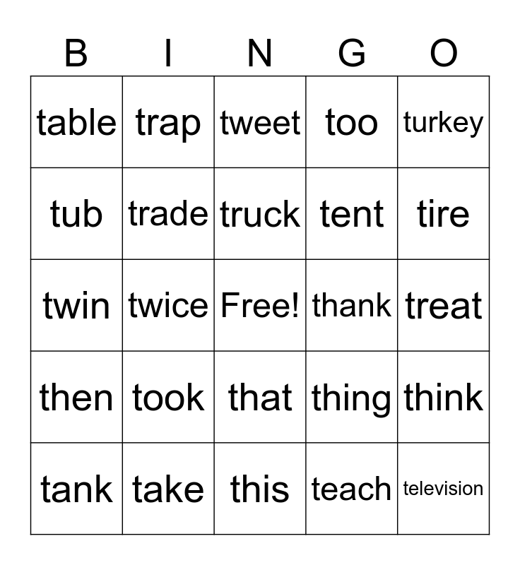 This bingo card has a free space and 24 words: took, take, truck, tank, turkey, table, tub, trap, thank, that, tent, twin, thing, think, trade, teach, treat, tweet, tire, twice, television, then, too and this.