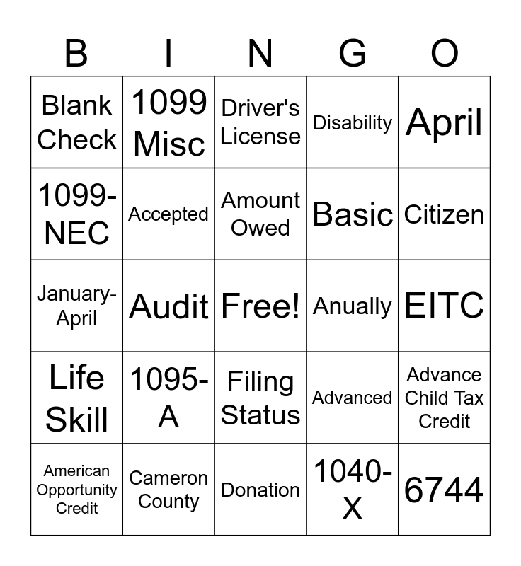 This bingo card has a free space and 53 words: 4012, 6744, 15-Apr, 1040-X, 1095-A, 1098-T, 1099 Misc, 1099-MISC, 1099-NEC, 13614-C, Accepted, Adjustment, Advance Child Tax Credit, Advanced, Allowance, American Opportunity Credit, Amount Owed, Anually, Appointment, April, Audit, Balance Due, Basic, Blank Check, Books, Cameron County, Cash Gift, Celebrate, Certification, Citizen, College Expenses, Credit, CTC, Deadline, Deduction, Dependent, Disability, Donation, Driver's License, Earned Income, Education, E-File, EITC, Employed, Extension, Filing Status, Intake/Interview & Quality Interview, ITIN, January-April, Life Skill, Medicaid, Medicare and MFJ.