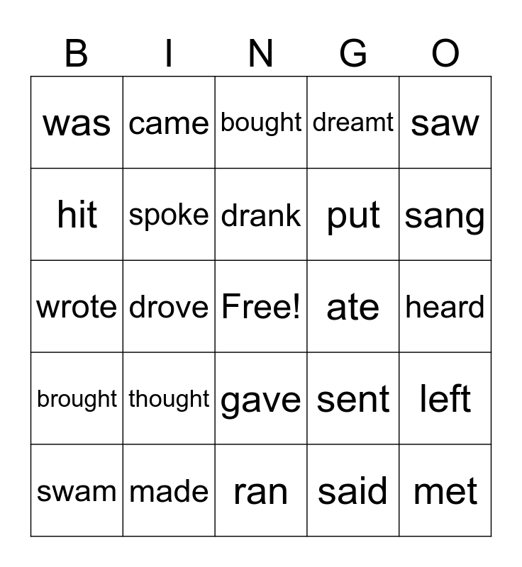 This bingo card has a free space and 29 words: went, made, bought, did, saw, was, spoke, drank, ate, left, swam, drove, said, met, wrote, read, ran, sent, sang, brought, thought, hurt, put, heard, hit, came, gave, dreamt and forgot.