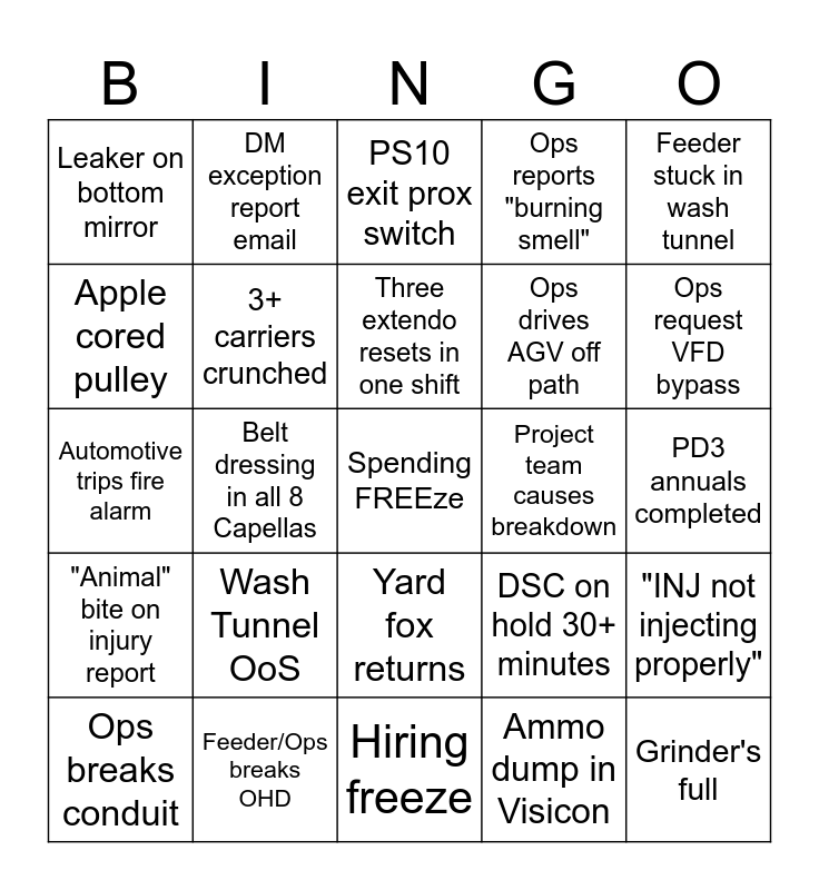 This bingo card has a free space and 24 words: Wash Tunnel OoS, Feeder/Ops breaks OHD, Three extendo resets in one shift, Ops breaks conduit, Feeder stuck in wash tunnel, Leaker on bottom mirror, Apple cored pulley, DM exception report email, Project team causes breakdown, Yard fox returns, Ops drives AGV off path, Automotive trips fire alarm, DSC on hold 30+ minutes, "INJ not injecting properly", 3+ carriers crunched, Ammo dump in Visicon, PD3 annuals completed, PS10 exit prox switch, Ops request VFD bypass, Belt dressing in all 8 Capellas, Grinder's full, "Animal" bite on injury report, Ops reports "burning smell" and Hiring freeze.
