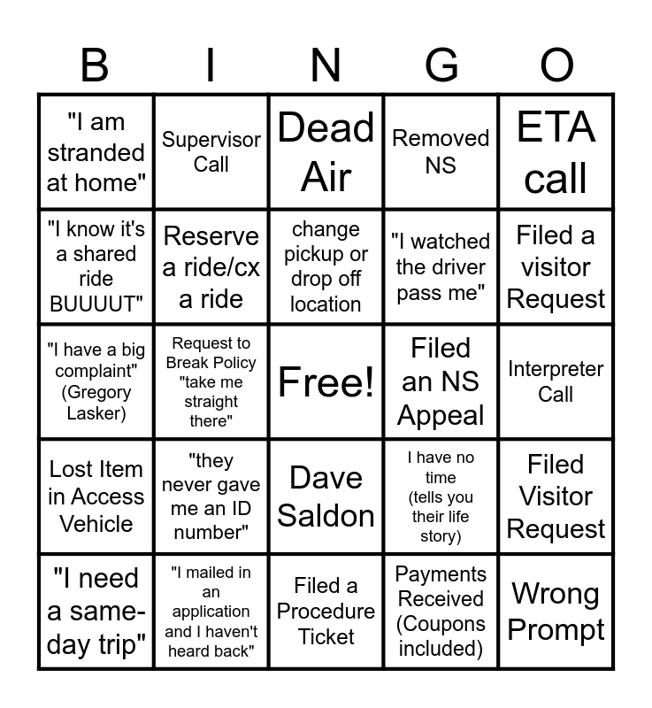 This bingo card has a free space and 24 words: "they never gave me an ID number", "I mailed in an application and I haven't heard back", change pickup or drop off location, "I need a same-day trip", ETA call, "I am stranded at home", "I know it's a shared ride BUUUUT", Supervisor Call, Filed an NS Appeal, Dave Saldon, "I watched the driver pass me", "I have a big complaint" (Gregory Lasker), I have no time (tells you their life story), Filed Visitor Request, Reserve a ride/cx a ride, Payments Received (Coupons included), Interpreter Call, Dead Air, Filed a visitor Request, Request to Break Policy "take me straight there", Wrong Prompt, Lost Item in Access Vehicle, Removed NS and Filed a Procedure Ticket.