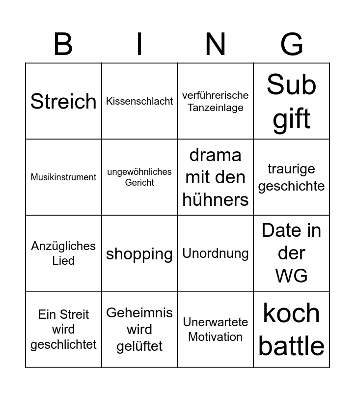 This bingo card has 16 words: Geheimnis wird gelüftet, Date in der WG, verführerische Tanzeinlage, Streich, Anzügliches Lied, Kissenschlacht, Unordnung, Unerwartete Motivation, Musikinstrument, ungewöhnliches Gericht, Ein Streit wird geschlichtet, Sub gift, shopping, traurige geschichte, drama mit den hühners and koch battle.