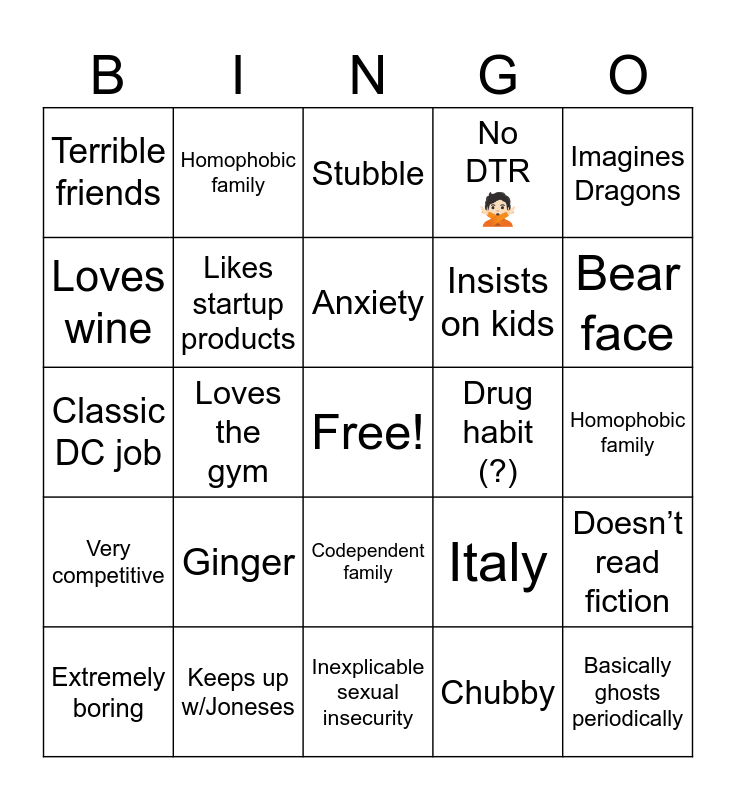 This bingo card has a free space and 24 words: Ginger, Keeps up w/Joneses, Anxiety, Extremely boring, Imagines Dragons, Terrible friends, Loves wine, Homophobic family, Drug habit (?), Codependent family, Insists on kids, Classic DC job, Italy, Doesn’t read fiction, Likes startup products, Chubby, Homophobic family, Stubble, Bear face, Loves the gym, Basically ghosts periodically, Very competitive, No DTR 🙅🏻 and Inexplicable sexual insecurity.