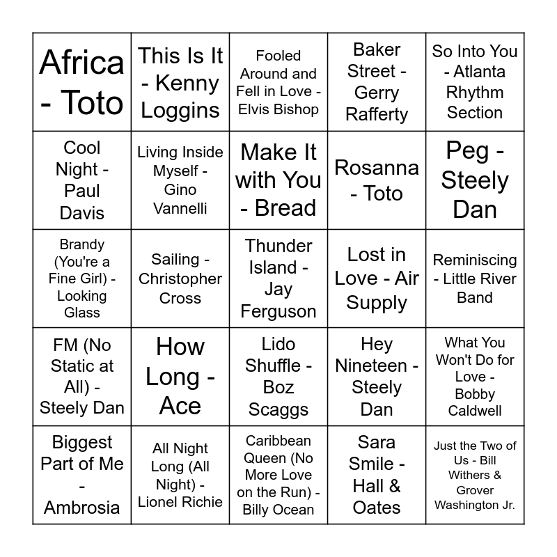 This bingo card has 72 words: What a Fool Believes - The Doobie Brothers, This Is It - Kenny Loggins, Sailing - Christopher Cross, Ride Like the Wind - Christopher Cross, Baby Come Back - Player, Summer Breeze - Seals & Croft, Baker Street - Gerry Rafferty, Escape (The Pina Coloda Song) - Rupert Holmes, Rosanna - Toto, Lowdown - Boz Scaggs, Biggest Part of Me - Ambrosia, I Keep Forgettin' (Every Time You're Near) - Michael McDonald, Peg - Steely Dan, Africa - Toto, I'd Really Love to See You Tonight - England Dan & John Ford Coley, Brandy (You're a Fine Girl) - Looking Glass, Hey Nineteen - Steely Dan, So Into You - Atlanta Rhythm Section, Steal Away - Robbie Dupree, Reminiscing - Little River Band, How Long - Ace, Thunder Island - Jay Ferguson, What You Won't Do for Love - Bobby Caldwell, Love Will Find a Way - Pablo Cruise, Cool Change - Little River Band, Kiss on My List - Jall & Oates, I Can't Tell You Why - Eagles, Key Largo - Bertie Higgins, Yah Mo B There - James Ingram & Michael McDonald, Moonlight Feels Right - Starbuck, All Night Long (All Night) - Lionel Richie, Dreams - Fleetwood Mac, I'm Not in Love - 10cc, Year of the Cat - Al Stewart, Sara Smile - Hall & Oates, Still the One - Orleans, You Are the Woman - Firefall, Sentimental Lady - Bob Welch, Cool Night - Paul Davis, You Can Do Magic - Kenny Loggins - Hearth to Heart, Lido Shuffle - Boz Scaggs, Just the Two of Us - Bill Withers & Grover Washington Jr., Rich Girl - Hall & Oates, Time Passages - Al Stewart, Lotta Love - Nicolette Larson, FM (No Static at All) - Steely Dan, Southern Cross - Crosby, Stills & Nash, Somebody's Baby - Jackson Browne, Ventura Highway - America, Eye in the Sky - The Alan Parsons Project, Crazy Love - Poco, Saturday in the Park - Chicago, You Make Loving Fun - Fleetwood Mac, Lost in Love - Air Supply, Kiss You All Over - Exile, I Saw the Light - Todd Rundgren, Fooled Around and Fell in Love - Elvis Bishop, Make It with You - Bread, We Just Disagree - Dave Mason, Lovely Day - Bill Withers, Sail on Sailor - The Beach Boys, Being with You - Smokey Robinson, Rise - Herb Alpert, Caribbean Queen (No More Love on the Run) - Billy Ocean, Hold the Line - Toto, Into the Night - Benny Mardones, Living Inside Myself - Gino Vannelli, Turn Your Love Around - George Benson, You Belong to Me - Carly Simon, Can't Fight This Feeling - REO Speedwagon, Islands in the Stream - Kenny Rogers and Dolly Parton and Every Time You Go Away - Paul Young.