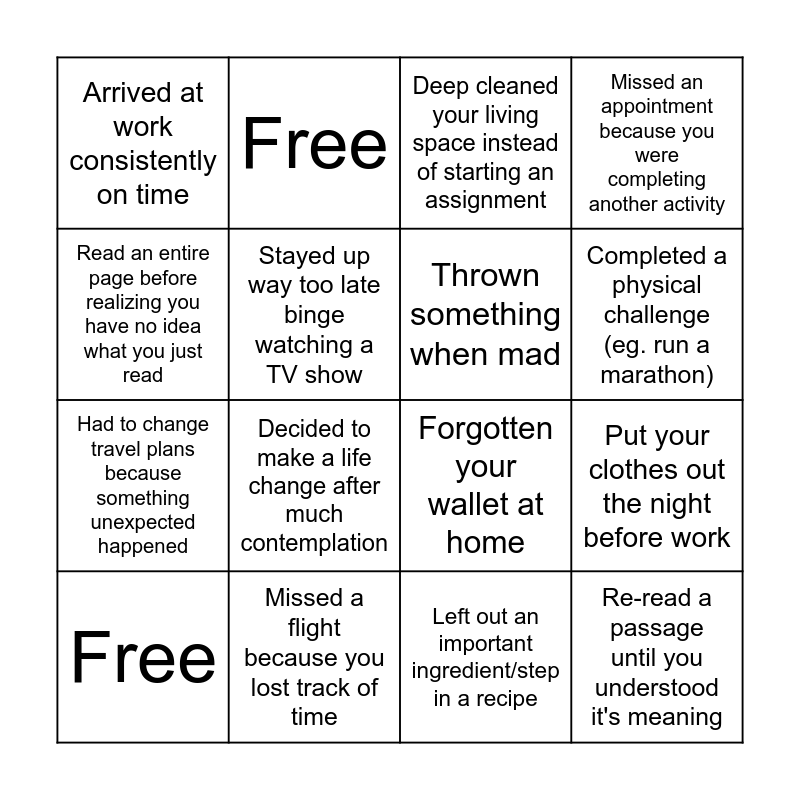 This bingo card has 16 words: Missed a flight because you lost track of time, Put your clothes out the night before work, Deep cleaned your living space instead of starting an assignment, Arrived at work consistently on time, Had to change travel plans because something unexpected happened, Free, Forgotten your wallet at home, Left out an important ingredient/step in a recipe, Read an entire page before realizing you have no idea what you just read, Stayed up way too late binge watching a TV show, Free, Missed an appointment because you were completing another activity, Decided to make a life change after much contemplation, Completed a physical challenge (eg. run a marathon), Thrown something when mad and Re-read a passage until you understood it's meaning.