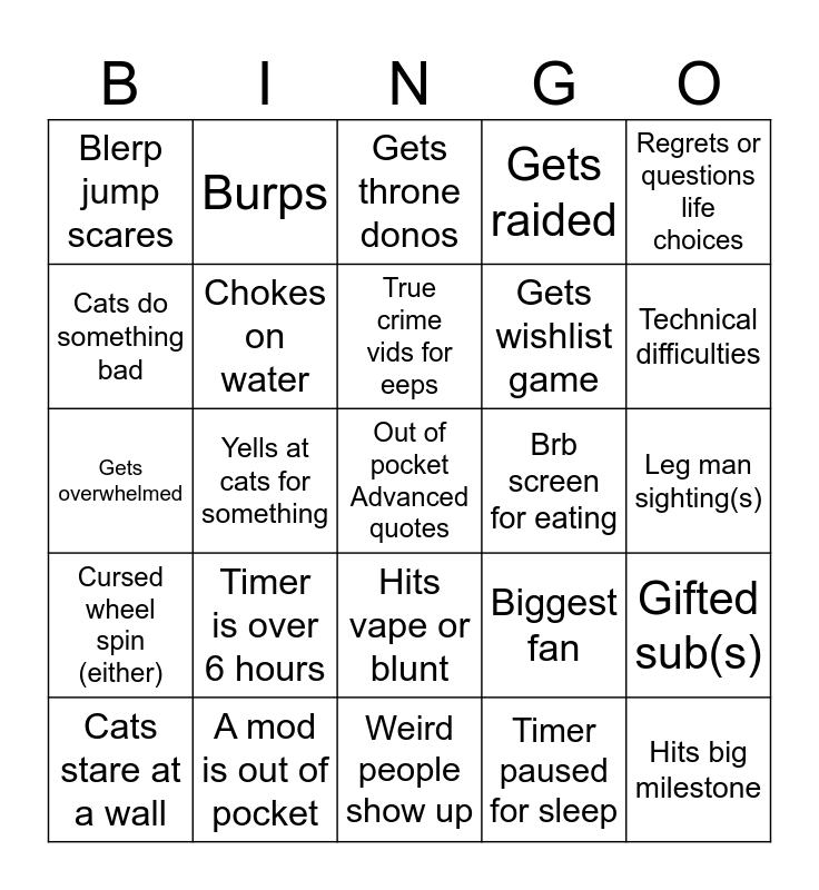 This bingo card has a free space and 24 words: Timer is over 6 hours, A mod is out of pocket, True crime vids for eeps, Cats stare at a wall, Regrets or questions life choices, Blerp jump scares, Cats do something bad, Burps, Brb screen for eating, Hits vape or blunt, Gets wishlist game, Gets overwhelmed, Biggest fan, Gifted sub(s), Chokes on water, Timer paused for sleep, Leg man sighting(s), Gets throne donos, Technical difficulties, Yells at cats for something, Hits big milestone, Cursed wheel spin (either), Gets raided and Weird people show up.