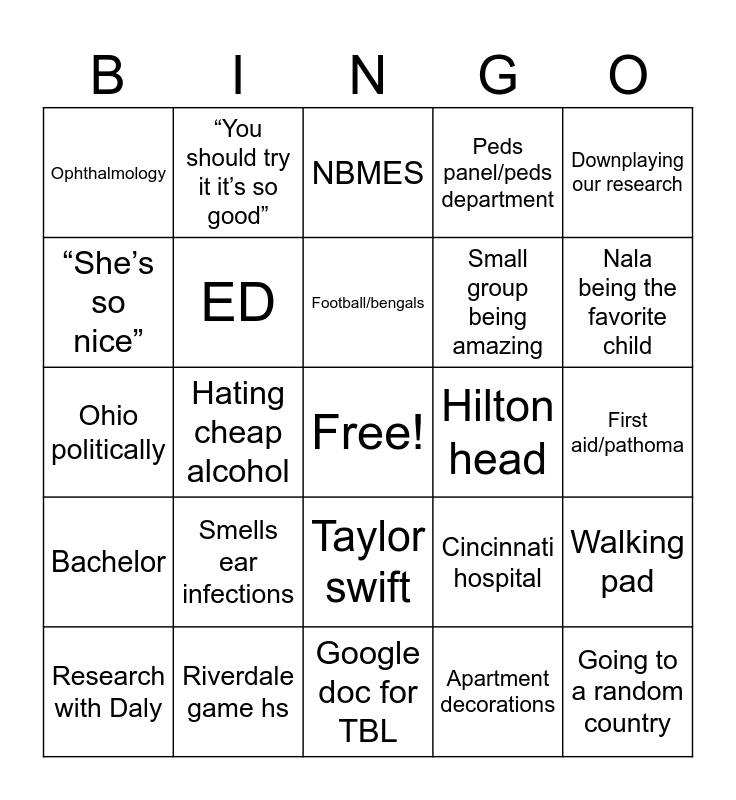 This bingo card has a free space and 24 words: Smells ear infections, Riverdale game hs, Football/bengals, Research with Daly, Downplaying our research, Ophthalmology, “She’s so nice”, “You should try it it’s so good”, Hilton head, Taylor swift, Small group being amazing, Ohio politically, Cincinnati hospital, Walking pad, ED, Apartment decorations, First aid/pathoma, NBMES, Nala being the favorite child, Hating cheap alcohol, Going to a random country, Bachelor, Peds panel/peds department and Google doc for TBL.