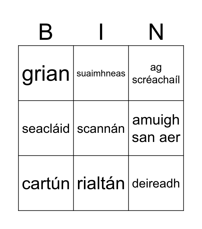 This bingo card has a free space and 11 words: tolg, rialtán, deireadh, cartún, suaimhneas, ag scréachaíl, amuigh san aer, cluichí, seacláid, grian and an teilifís.