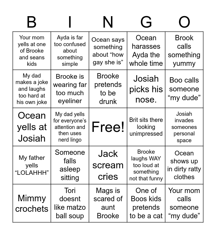 This bingo card has a free space and 24 words: Someone falls asleep sitting, Tori doesnt like matzo ball soup, Brooke pretends to be drunk, Mimmy crochets, Brook calls something yummy, Your mom yells at one of Brooke and seans kids, My dad makes a joke and laughs too hard at his own joke, Ayda is far too confused about something simple, Brit sits there looking unimpressed, Jack scream cries, Josiah picks his nose., Ocean yells at Josiah, Brooke laughs WAY too loud at something not that funny, Ocean shows up in dirty ratty clothes, Brooke is wearing far too much eyeliner, One of Boos kids pretends to be a cat, Josiah invades someones personal space, Ocean says something about “how gay she is”, Boo calls someone “my dude”, My dad yells for everyone’s attention and then uses nerd lingo, Your mom calls someone “my dude”, My father yells “LOLAHHH”, Ocean harasses Ayda the whole time and Mags is scared of aunt Brooke.