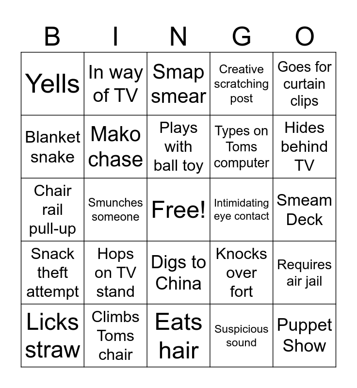 This bingo card has a free space and 24 words: Hops on TV stand, Climbs Toms chair, Plays with ball toy, Licks straw, Goes for curtain clips, Yells, Blanket snake, In way of TV, Intimidating eye contact, Digs to China, Types on Toms computer, Chair rail pull-up, Knocks over fort, Requires air jail, Mako chase, Suspicious sound, Smeam Deck, Smap smear, Hides behind TV, Smunches someone, Puppet Show, Snack theft attempt, Creative scratching post and Eats hair.