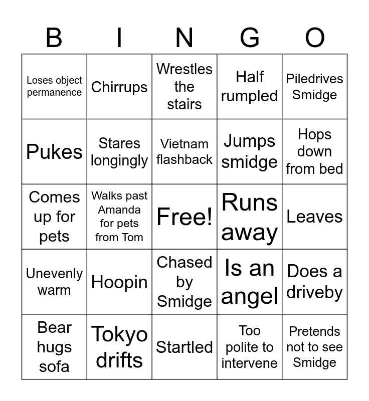 This bingo card has a free space and 24 words: Hoopin, Tokyo drifts, Vietnam flashback, Bear hugs sofa, Piledrives Smidge, Loses object permanence, Pukes, Chirrups, Runs away, Chased by Smidge, Jumps smidge, Comes up for pets, Is an angel, Does a driveby, Stares longingly, Too polite to intervene, Leaves, Wrestles the stairs, Hops down from bed, Walks past Amanda for pets from Tom, Pretends not to see Smidge, Unevenly warm, Half rumpled and Startled.