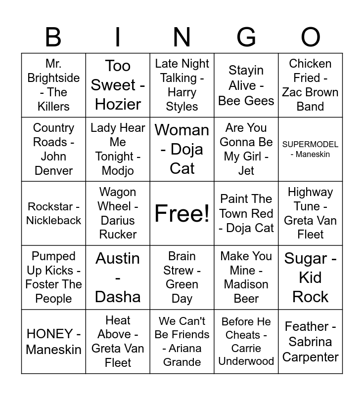 This bingo card has a free space and 46 words: Espresso - Sabrina Carpenter, Feather - Sabrina Carpenter, No Body, No Crime - Taylor Swift, We Can't Be Friends - Ariana Grande, Austin - Dasha, End Of Beginning - Djo, Too Sweet - Hozier, Edamame - BBNO$, Country Roads - John Denver, Sweet Caroline - Neil Diamond, Lady Hear Me Tonight - Modjo, Stayin Alive - Bee Gees, Sugar - Kid Rock, Make You Mine - Madison Beer, Into You - Ariana Grande, 7 Rings - Ariana Grande, Woman - Doja Cat, Paint The Town Red - Doja Cat, 23 - Chayce Beckham, Chicken Fried - Zac Brown Band, Wagon Wheel - Darius Rucker, Before He Cheats - Carrie Underwood, Mr. Brightside - The Killers, Are You Gonna Be My Girl - Jet, Aint No Rest For The Wicked - Cage The Elephant, SUPERMODEL - Maneskin, HONEY - Maneskin, Basket Case - Green Day, Brain Strew - Green Day, Pumped Up Kicks - Foster The People, I Bet You Look Good On The Dancefloor - Arctic Monkeys, Nonsense - Sabrina Carpenter, You're Gonna Go Far Kid - The Offspring, Pretty Fly - The Offspring, Teenagers - My Chemical Romance, Heat Above - Greta Van Fleet, Highway Tune - Greta Van Fleet, Safari Song - Greta Van Fleet, Paralyzer - Finger Eleven, Friends in Low Places - Garth Brooks, Satellite - Rise Against, Late Night Talking - Harry Styles, Rockstar - Nickleback, Hold The Line - TOTO, Country Song - Seether and W.I.T.C.H. - Devon Cole.