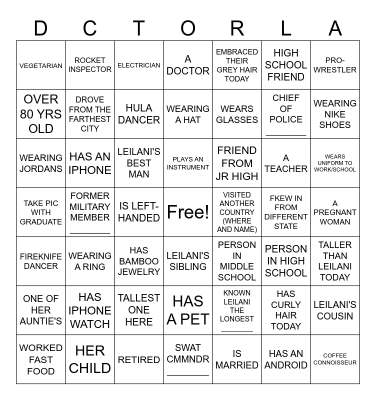 This bingo card has a free space and 48 words: KNOWN LEILANI THE LONGEST ________, CHIEF OF POLICE ________, SWAT CMMNDR ________, FORMER MILITARY MEMBER ________, LEILANI'S BEST MAN, A PREGNANT WOMAN, ROCKET INSPECTOR, HER CHILD, HIGH SCHOOL FRIEND, LEILANI'S SIBLING, PRO-WRESTLER, A DOCTOR, A TEACHER, FRIEND FROM JR HIGH, ONE OF HER AUNTIE'S, FKEW IN FROM DIFFERENT STATE, OVER 80 YRS OLD, WEARING NIKE SHOES, HAS CURLY HAIR TODAY, EMBRACED THEIR GREY HAIR TODAY, WEARS GLASSES, IS LEFT-HANDED, VEGETARIAN, DROVE FROM THE FARTHEST CITY, LEILANI'S COUSIN, HULA DANCER, WEARS UNIFORM TO WORK/SCHOOL, WORKED FAST FOOD, PLAYS AN INSTRUMENT, HAS AN IPHONE, HAS AN ANDROID, VISITED ANOTHER COUNTRY (WHERE AND NAME), TALLER THAN LEILANI TODAY, HAS IPHONE WATCH, TAKE PIC WITH GRADUATE, PERSON IN MIDDLE SCHOOL, PERSON IN HIGH SCHOOL, WEARING JORDANS, HAS BAMBOO JEWELRY, TALLEST ONE HERE, FIREKNIFE DANCER, COFFEE CONNOISSEUR, ELECTRICIAN, RETIRED, WEARING A HAT, HAS A PET, WEARING A RING and IS MARRIED.